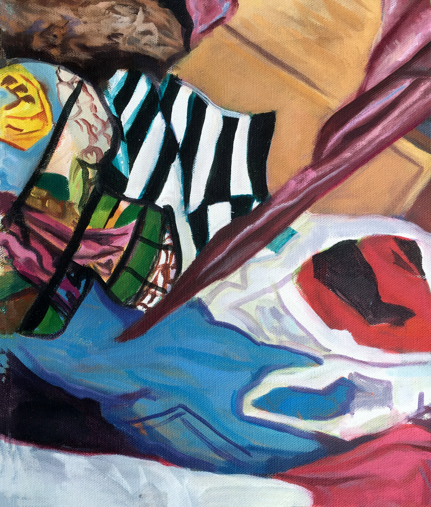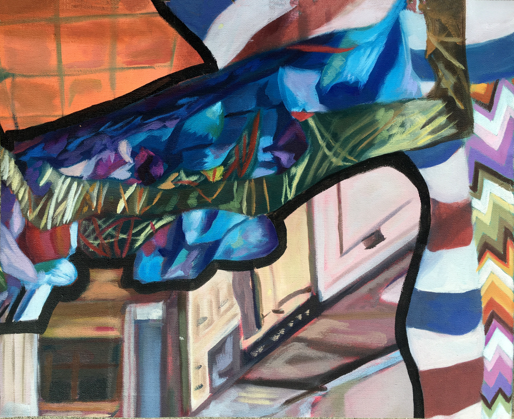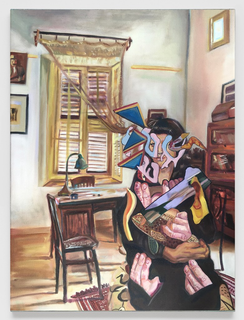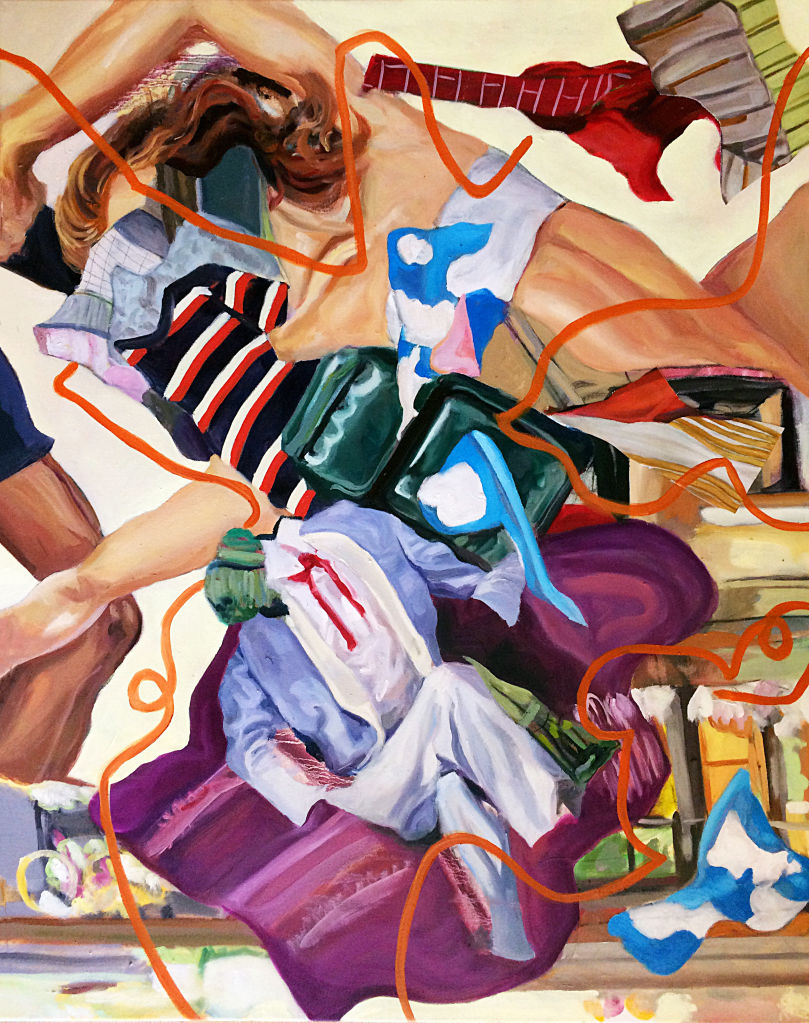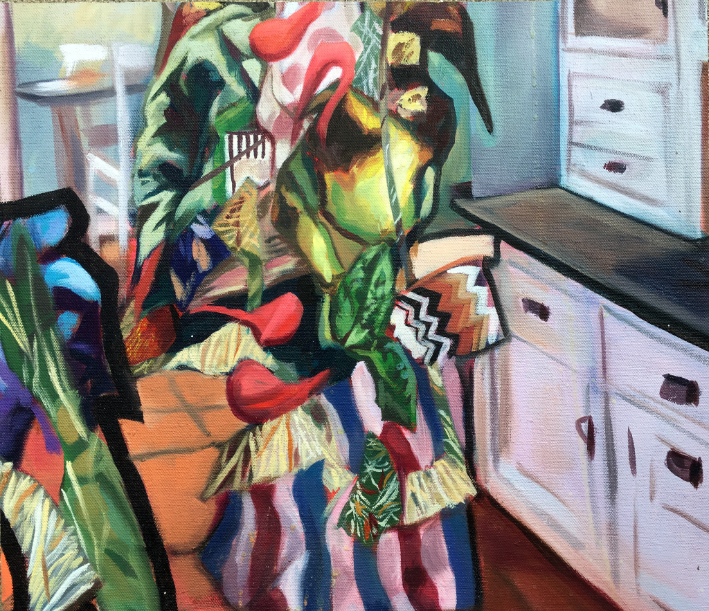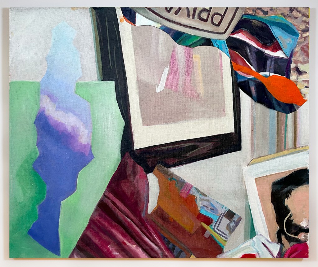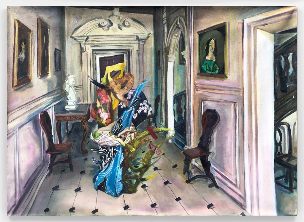 Possession, 2024. Oil on canvas, 24 x 32 in.Domestic Possessions II, 2021. Oil on canvas, 42 x 42 in.Domestic Possessions I, 2021. Oil on canvas, 24 x 36 in.Haunting in the Hall, 2021. Oil on canvas, 42 x 28 in.Tilted Storage, 2022. Oil on canvas. 30 x 26 in.
